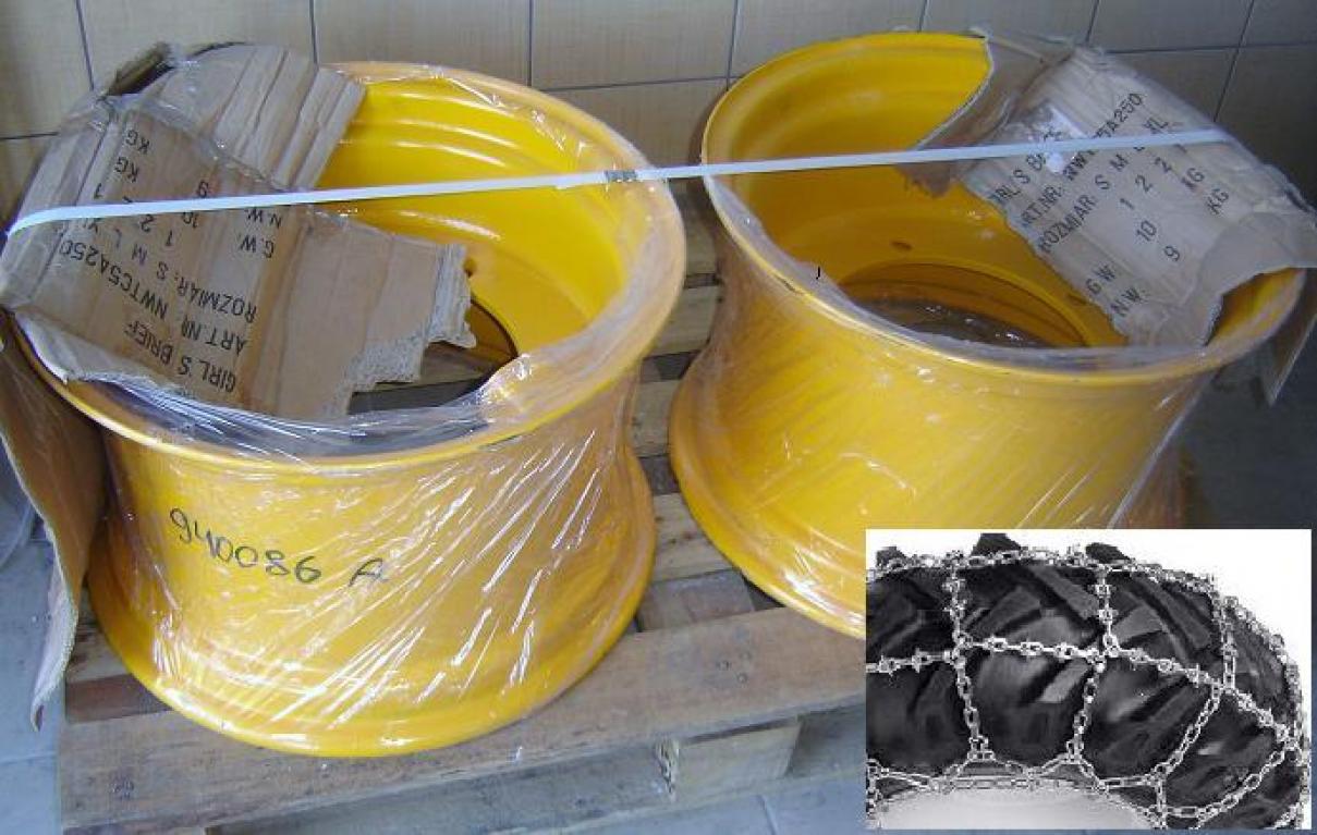 Felgi, opony, łańcuchy do maszyn budowlanych