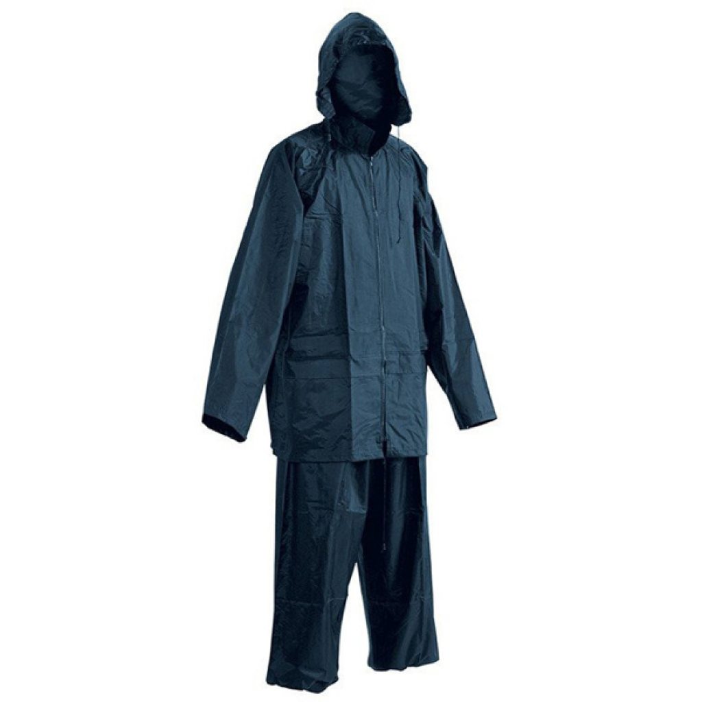 - dwuczęściowy wodoodporny komplet z kapturem – przeciwdeszczowy płaszcz ¾ z kapturem chowanym w kołnierzu oraz spodnie z elastyczną gumą w pasie