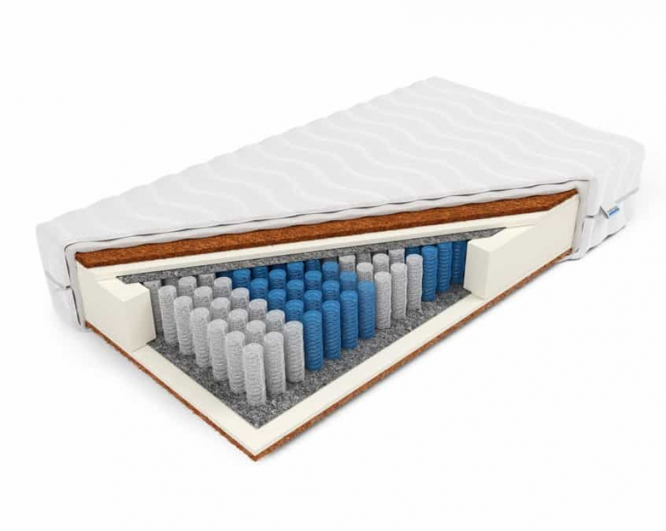Podwójna mata kokosowa – twarda mata wyprodukowana ze 100% naturalnych włókien kokosowych z łupiny orzecha kokosowego wymieszanych z płynnym lateksem. Materac z matą z kokosu jest bardziej przewiewny, dobrze pochłania wilgoć, ma właściwości antyalergiczne. To najlepszy wybór dla osób lubiących twarde materac. Podwójna mata (2 cm po obu stronach materaca) niweluje uczucie zapadania się.