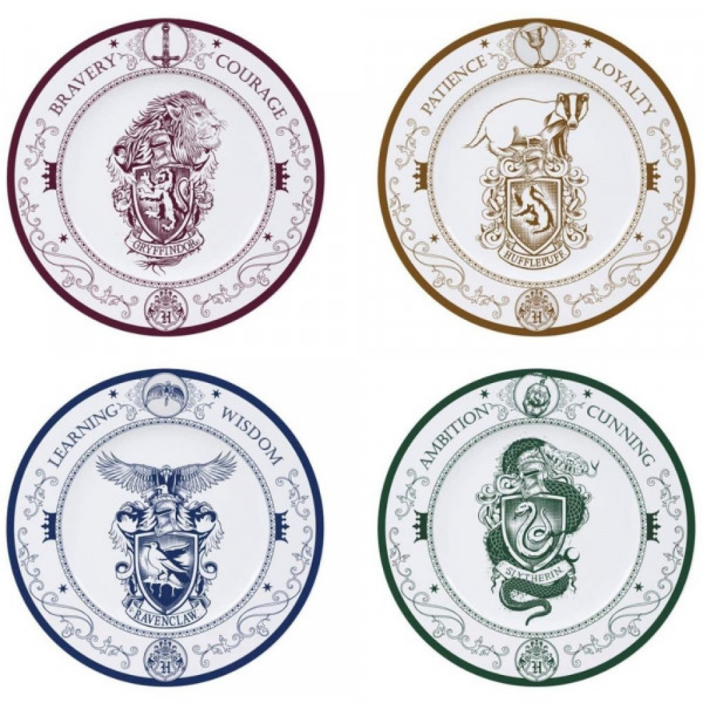 Można w razie potrzeby jeść na serwetce lub bezimiennym talerzyku, ale jeśli w sercu masz Hogwart, musisz mieć na stole tę czarodziejską zastawę! Oto komplet talerzy prosto ze Szkoły Magii i Czarodziejstwa w Hogwarcie. Średnica 21 centymetrów sprawia, że sprawdzą się zarówno do śniadania, obiadu, kolacji, jak i do serwowania przekąsek. A bogate zdobienie w dekoracyjny motyw herbu każdego z domów oraz wypisane główne cechy ich mieszkańców sprawiają, że aż chce się je ciągle stawiać na widoku!