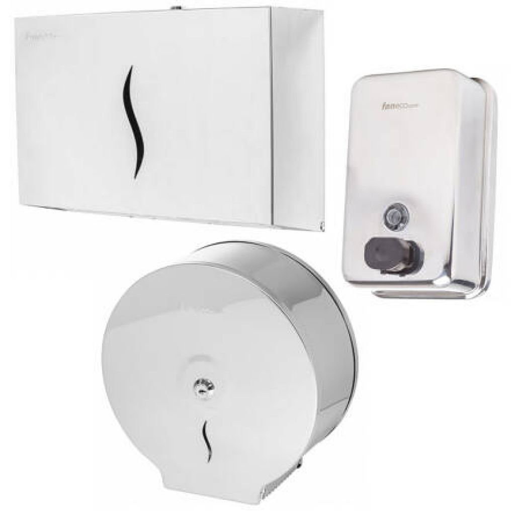 Zawierający wszystkie niezbędne elementy wyposażenia publicznej toalety, ten komplet uniwersalnych akcesoriów łazienkowych wykonanych ze szlachetnej stali polerowanej pozwala w łatwy sposób oraz niskim kosztem całkowicie urządzić każdy sanitariat. Wytrzymałe i cechujące się uniwersalnym designem naścienne pojemniki na papier do rąk oraz na papier toaletowy, wraz z pojemnym dozownikiem na mydło dolewane, wyposażono w ułatwiające kontrolowanie poziomu znajdujących się w nich materiałów eksploatacyjnych okienka. Dzięki stylistyce swoich połyskujących pokryw nie tylko zatem doskonale dopasowują się do wystroju większości łazienek, ale też sprawiają bardzo mało kłopotu podczas codziennego czyszczenia oraz doglądania i uzupełniania papieru toaletowego, ręczników do rąk czy też mydła w płynie. Ich odporność na uszkodzenia i duża pojemność sprawiają, że doskonale nadają się do szpitalnych, szkolnych, biurowych i publicznych toalet o dużym natężeniu ruchu.
