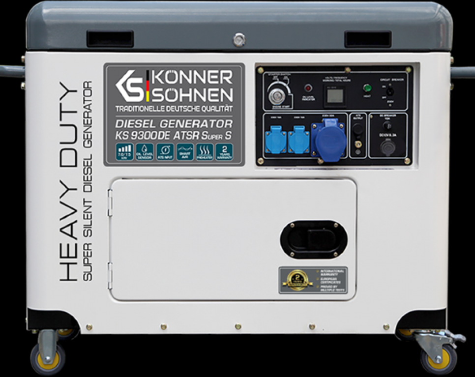Jednofazowy model generatora diesla KS 9300DE ATSR SUPER S, którego podstawowym celem jest dostarczanie wysokiej jakości zasilania zarówno wśród właścicieli domów prywatnych, jak i dla małych przedsiębiorstw. Dzięki zaawansowanemu systemowi redukcji szumów z podwójnym tłumikiem i specjalnej konstrukcji obudowy zapewniony jest poziom hałasu Lpa (7 m) wynoszący 68 dB, nawet przy maksymalnym obciążeniu. Co sprawia, że model ten idealnie nadaje się do zastosowania w sklepach, kawiarniach, restauracjach i innych placówkach, w których wymagane jest przestrzeganie najbardziej komfortowych warunków. Może być wyposażony w system automatycznego uruchamiania, który pozwoli na uruchomienie generatora w przypadku awarii sieci zasilającej.