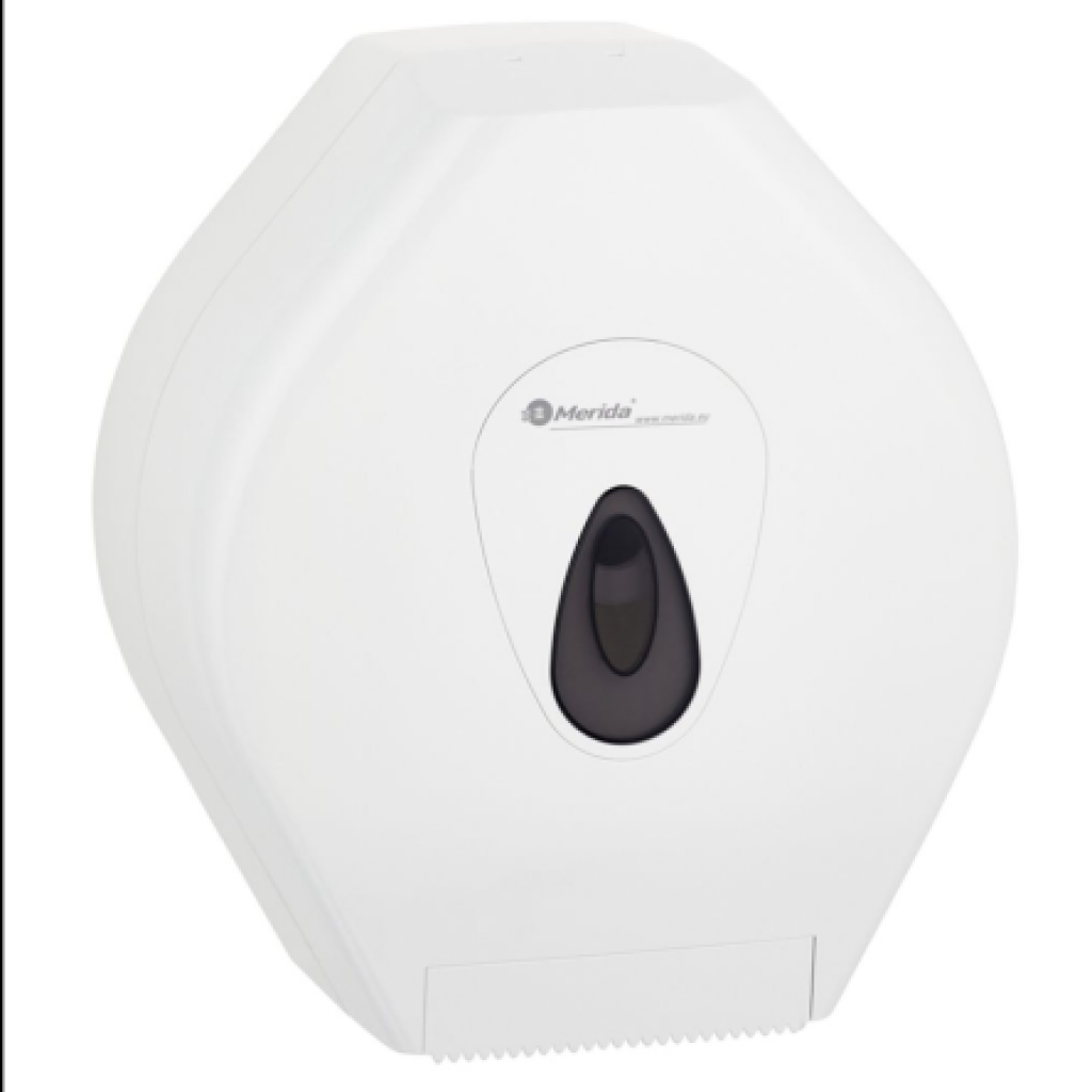 Plastikowy podajnik papieru toaletowego MERIDA TOP MEGA w kolorze białym z szarym okienkiem, pozwalającym na stałą kontrolę ilości wkładu. Dozownik montowany naściennie.