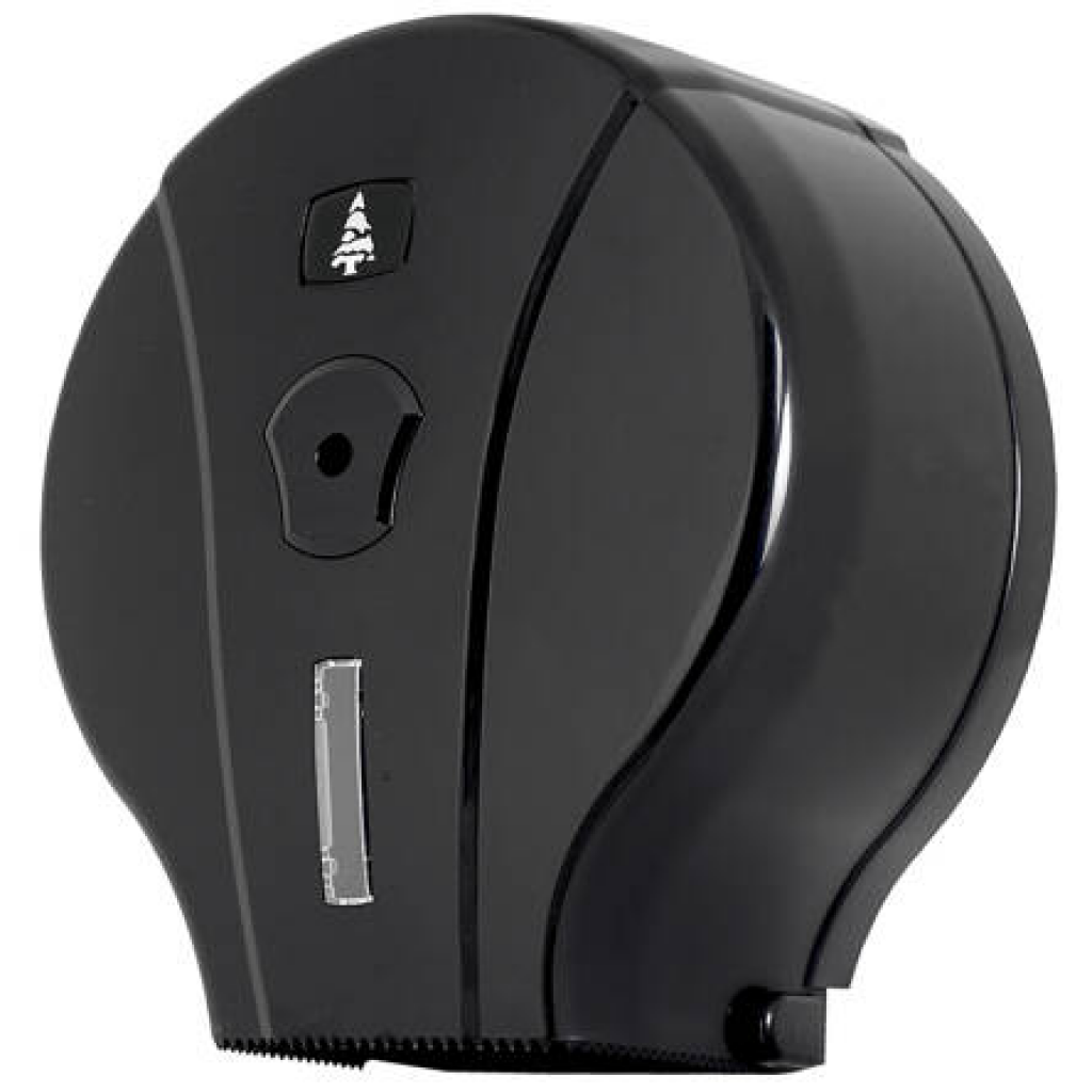Elegancki czarny pojemnik na papier toaletowy w roli JUMBO, należący do linii wykonanych z tworzywa sztucznego elementów wyposażenia toalet EKO, jest prostym, ale jednocześnie wyjątkowo ergonomicznym akcesorium łazienkowym, które odpowiada na podstawowe potrzeby zarówno niedużych ogólnodostępnych łazienek, jak i cieszących się dużym natężeniem ruchu toalet publicznych. Nieduża, plastikowa obudowa ma nienachalny, neutralny design, który łatwo dopasować do dowolnej aranżacji wnętrza, wzbogacając je tym samym za pomocą interesującego czarnego detalu. Mieszący role papieru o średnicy 19 cm podajnik świetnie sprawdzi się w ubikacjach i kabinach toaletowych w których nie ma wiele miejsca, a znajdujący się z przodu obudowy wizjer ułatwi kontrolowanie ilości zużytego już papieru i będzie pomocny podczas sprzątania łazienki oraz uzupełniania materiałów eksploatacyjnych. Plastikowy zamek sprawia, że pojemnik ten doskonale sprawdzi się w publicznych sanitariatach, narażonych na wandalizm lub kradzieże.